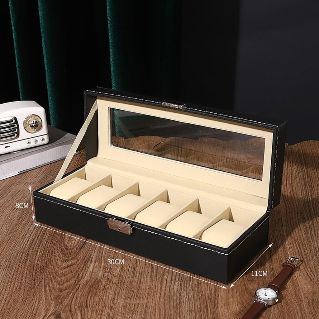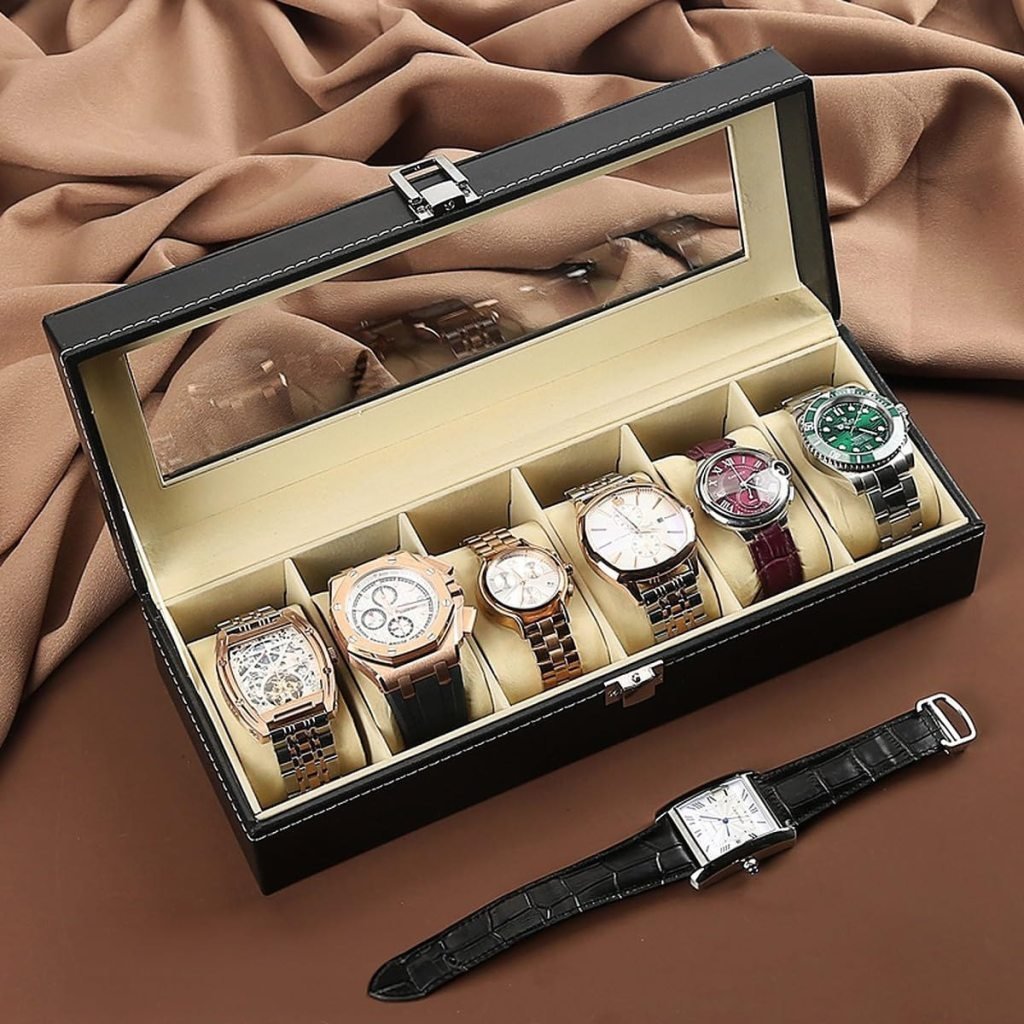 Organize and protect your valuable watches with the 6 Slot Watch Collection Box. Crafted for both men and women, this elegant box features soft cushioned slots to prevent scratches and damage, a sturdy build for lasting durability, and a stylish design perfect for any dresser or closet. Ideal for collectors and enthusiasts, it keeps your watches neatly displayed and easily accessible. Enhance your lifestyle and safeguard your accessories with this premium storage solution.