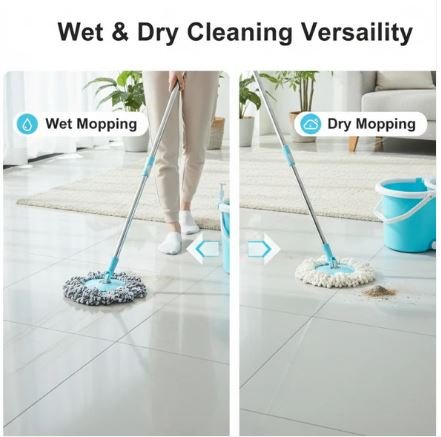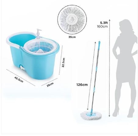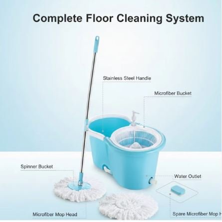 - Two micro fiber cloth which is non abrasive and super absorbent fibers which aborb dirt and water easily, no more bending hence no more back pain for your cleaning, special features: 360 spinner, extendable steel handle, outlet/drain spout, 2 micro fiber heads/refill, solution dispenser