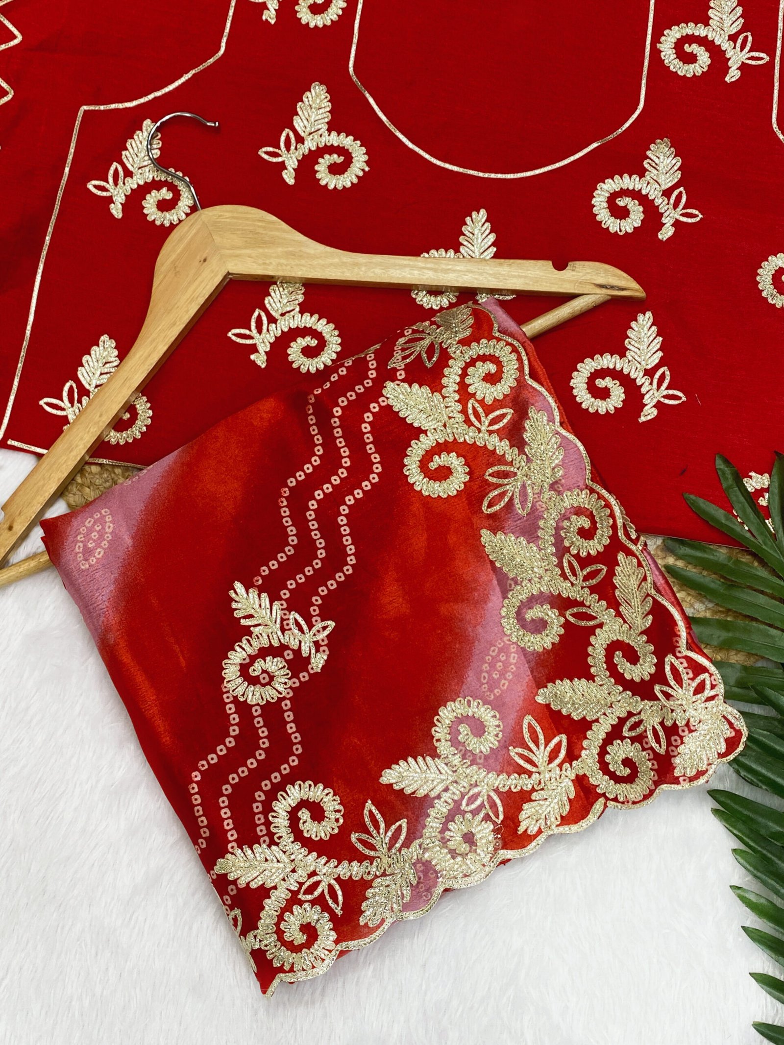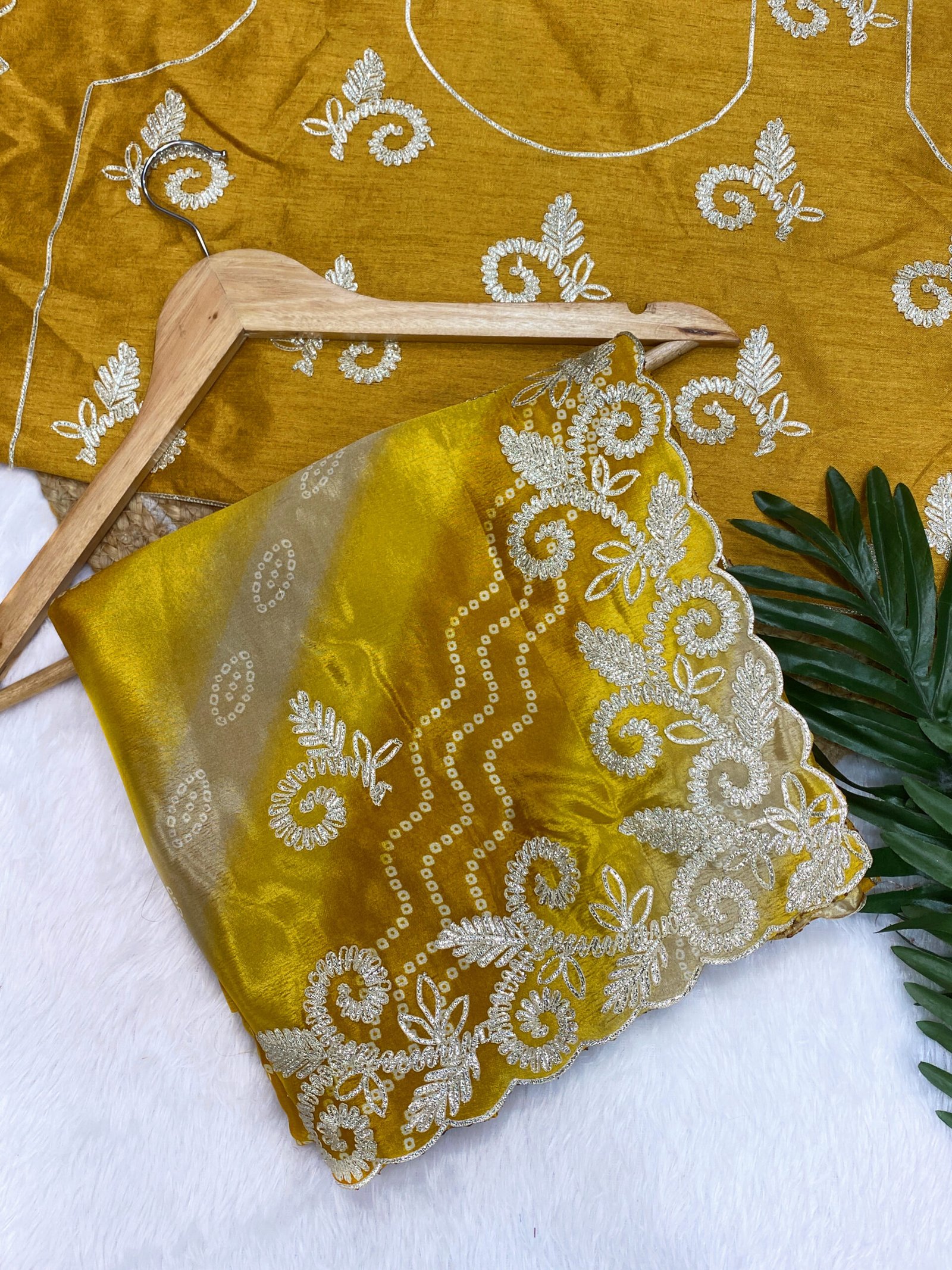 Technical Specs: Fabric: Chinon | Blouse: Banglory Silk | Type: Gotta Patti Embroidery Work. Perfect for any occasion.