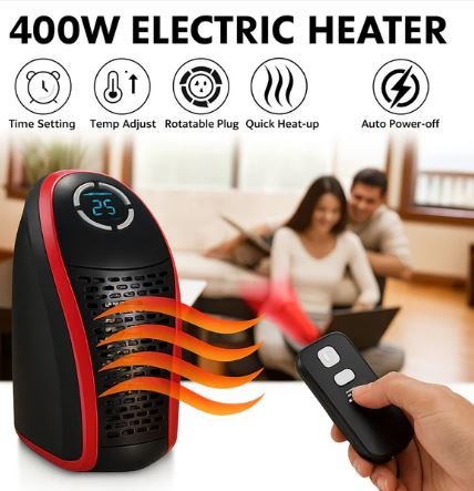 This Wonder Warm 400W wall plug room heater is designed to give you quick, comfortable warmth exactly where you need it, without bulky floor units or complicated installation. The compact heater plugs directly into a wall socket, instantly converting any corner of your home or office into a cozy personal space. Its powerful 400W heating element delivers a steady stream of warm air through a wide vent grille, helping to gently raise the room temperature while remaining energy-efficient. The included remote control allows you to adjust speed and set the timer from your bed, sofa or work desk, so you can enjoy warmth without getting up. A built-in digital control panel on the top provides easy temperature and mode setting, while the sleek black-and-red body blends neatly into modern interiors. Lightweight, portable and safe, this heater is perfect for spot heating bedrooms, study rooms, office cabins and small living spaces during chilly days and nights.